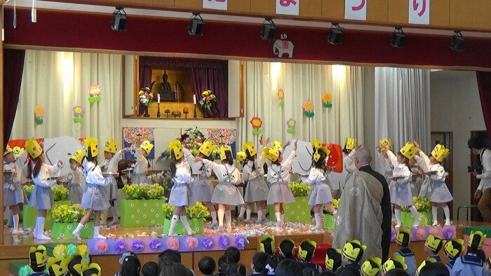 年長の女の子がお花をまく「天童散華」を、年長の男の子が礼拝とのの様の像に甘茶をかける「みそそぎ」をしました。